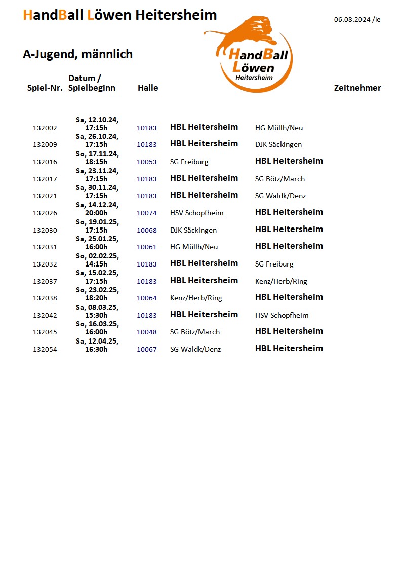 Gegen die neu gegründete Spielgemeinschaft aus HSG Freiburg und SFE Freiburg mussten unsere A-Jungs nach 5 Wochen Spielpause erst zum zweiten Mal in dieser Saison antreten. Für den Gastgeber war es das 5.Saisonspiel, was sicher ein Vorteil ist, da man sich so besser einspielen konnte. Die Mannschaft von Jakob Feuerstein musste mit Felix und Joel auf zwei Stammspieler verzichten, hatten aber trotzdem 10 einsatzfähige Mannen an Bord. Nur beim 1:0 waren die Löwen in Rückstand, konnten aber in den folgenden vier Spielminuten 5 Tore erzielen ohne dass man ein Gegentor kassierte. Bis zum 2:7 lief alles nach Plan, auch wenn man schon in den ersten Minuten große Probleme mit dem Spielgerät hatte. Dies zog sich auch durch das gesamte Spiel und war zusammen mit der Abschlußschwäche von Außen ein Grund dafür, dass es Heitersheim nicht gelang sich deutlicher abzusetzen. Nach einer Auszeit des Gegners konnten sich diese wieder auf 7:9 herankämpfen und als kurze Zeit später durch 3 Strafzeiten nur noch drei Heitersheimer Feldspieler sich doppelt so vielen Gegnerischen gegenüber sah, konnte Freiburg sogar zum 8:9 verkürzen. Nun kam die stärkste Phase unseres Teams und es innerhalb von acht Minuten auf 10:17 davon zu ziehen. Diese sieben Tore Differenz nahm man mit in die Kabine und die Heitersheimer Zuschauer hatten die Hoffnung, dass man nach dem Wechsel so weiter machen würde.