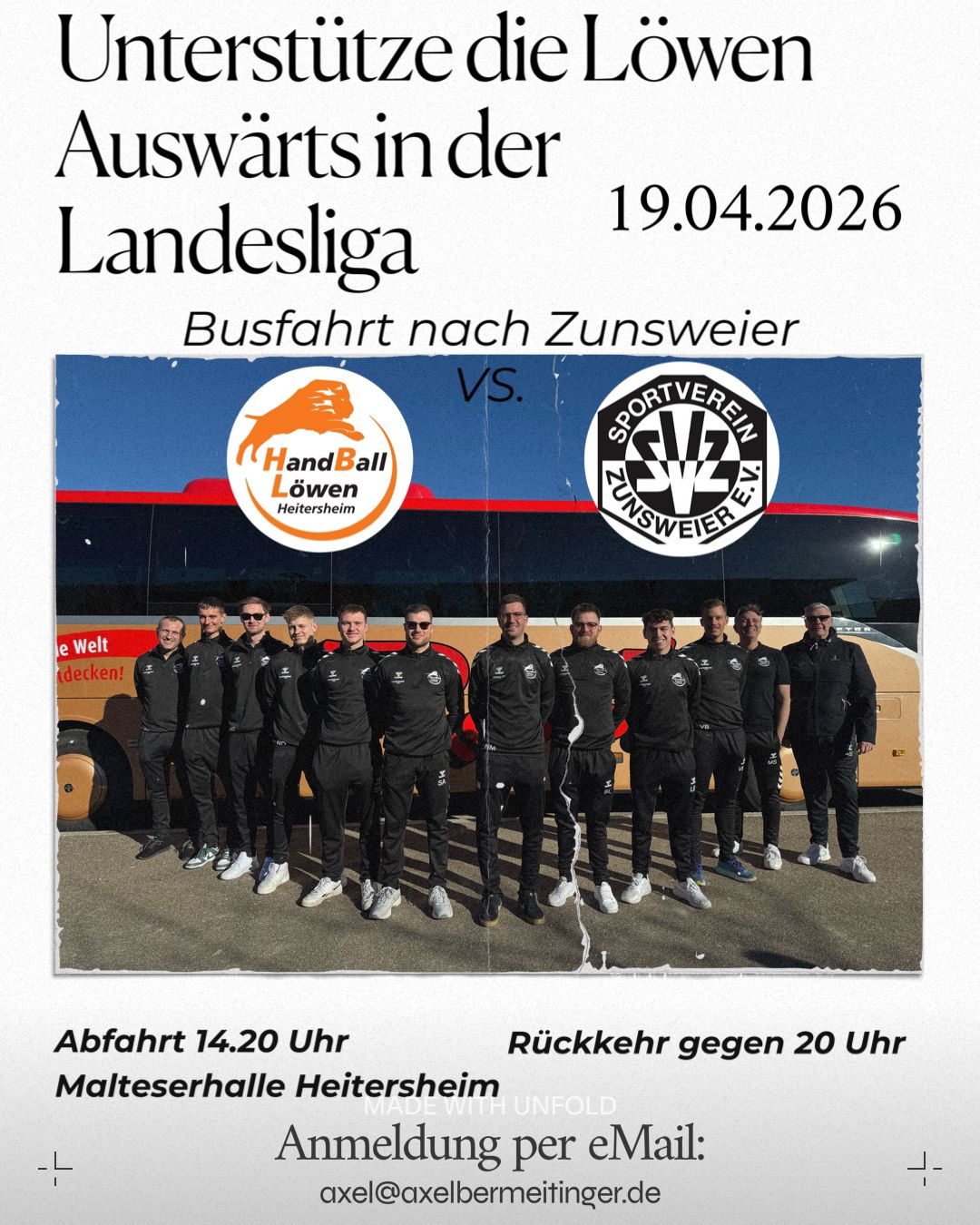 Die Löwen treten am kommenden Sonntag, den 19.04.2026 um 14 Uhr in Zunsweier gegen den Tabellenzweiten an. Gäste und Fans sind willkommen, im Mannschaftsbus mitzureisen.